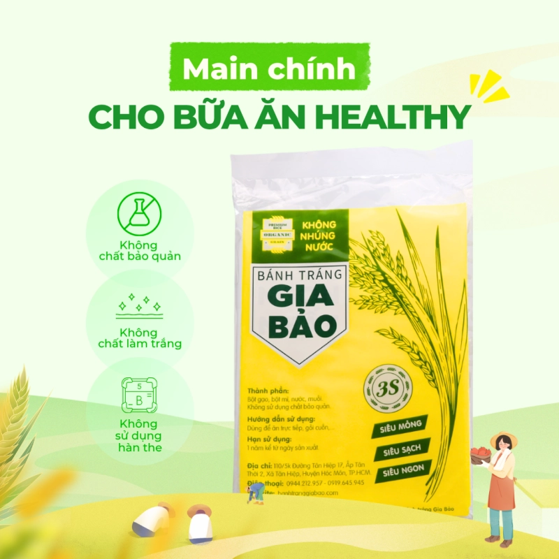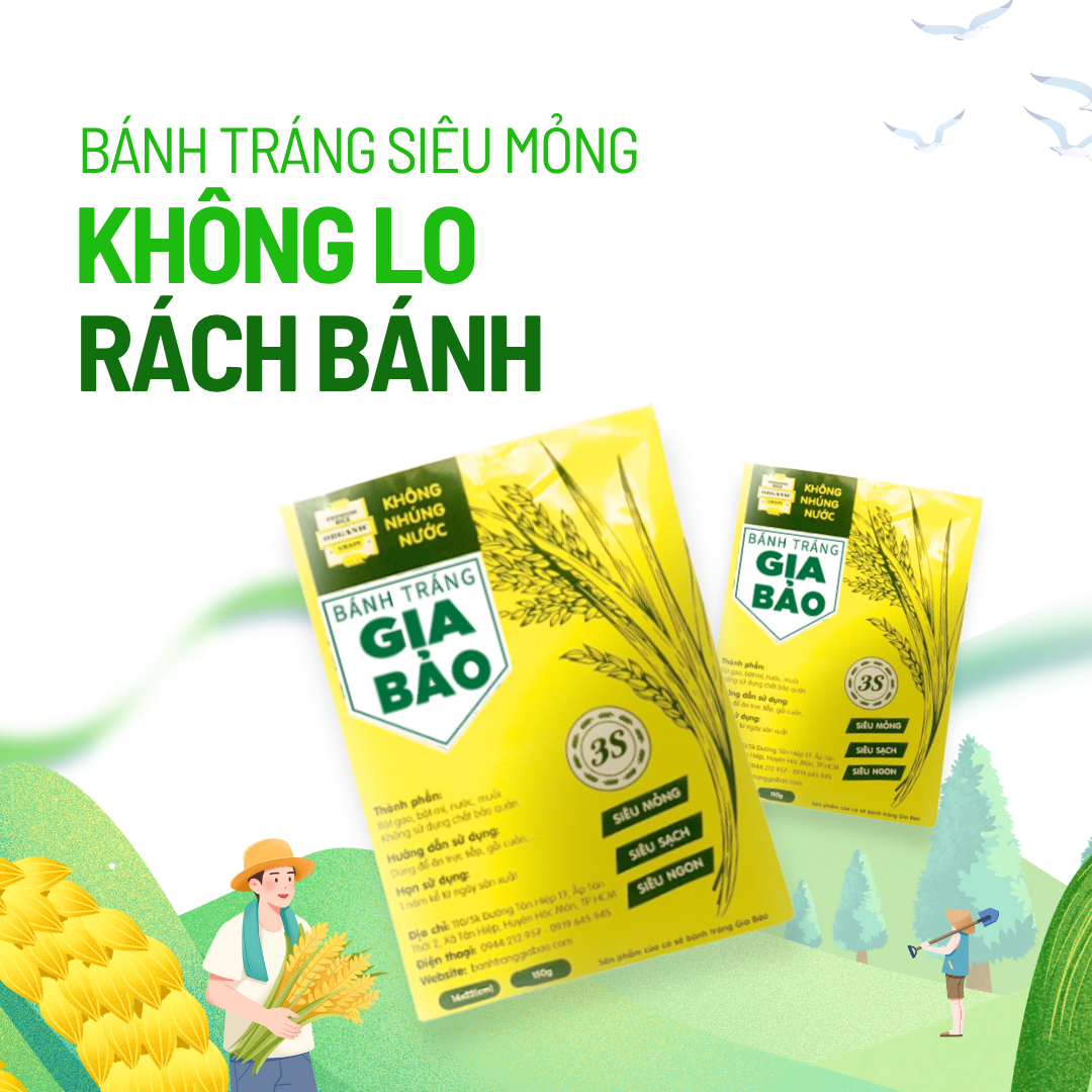 Mỗi chiếc bánh tráng Gia Bảo được làm từ bột khoai mì, bột gạo nguyên chất, nước sạch và một chút muối tinh khiết, tạo nên vị mằn mặn nhẹ, thoáng qua nơi đầu lưỡi, giúp bánh có thể ăn ngay mà không hề nhạt. Từng lá bánh lưu giữ trọn mùi thơm đặc trưng của gạo, của củ mì, được làm nên bằng sự kiên nhẫn của người thợ, không thêm bất kỳ phụ gia nào – để mỗi lần thưởng thức vừa ngon miệng vừa an toàn cho sức khỏe.